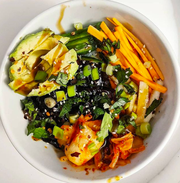 STEP 12: Add the rice vermicelli to the bowl followed by the tofu, carrots, cucumbers, avocado, pickled daikon, and kimchi.